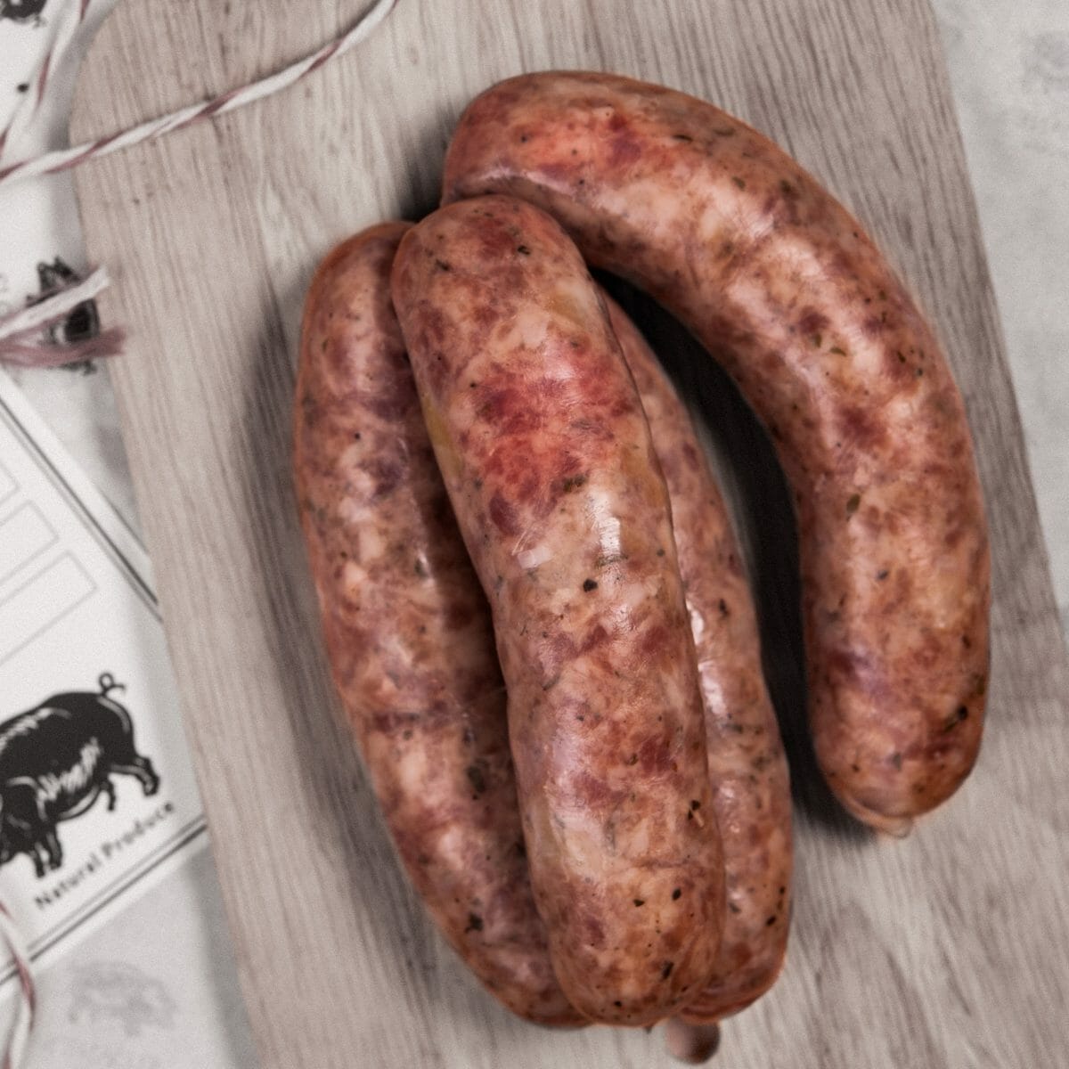 A British style sausage with sauteed apples and herbs. The apples give it a slight sweetness and is very popular with kids.